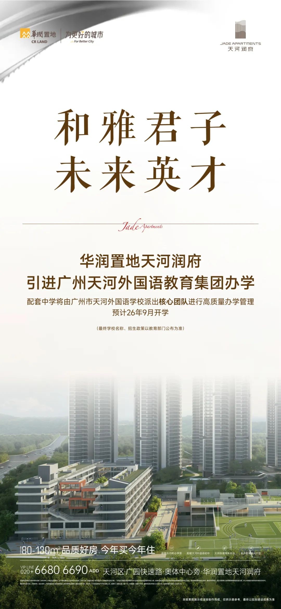 免责条款:本宣传资料旨在提供相关信息,仅供参考,不构成合同要约,也不意味着本公司对此作出承诺,所有文字、数据及图片等均是设计效果的表达和示意,一切有关房屋的具体信息均以合同约定及政府最终审批为准,排除因政府规划及开发商未能控制等原因而发生变化,本公司保留对宣传资料修改的权利。开发商:广州市润喆房地产开发有限公司。备案名:润熙花园。推广名:天河润府,预售许可证:穗房预(网)字第20240039号。本资料制作时间:2025年7月。