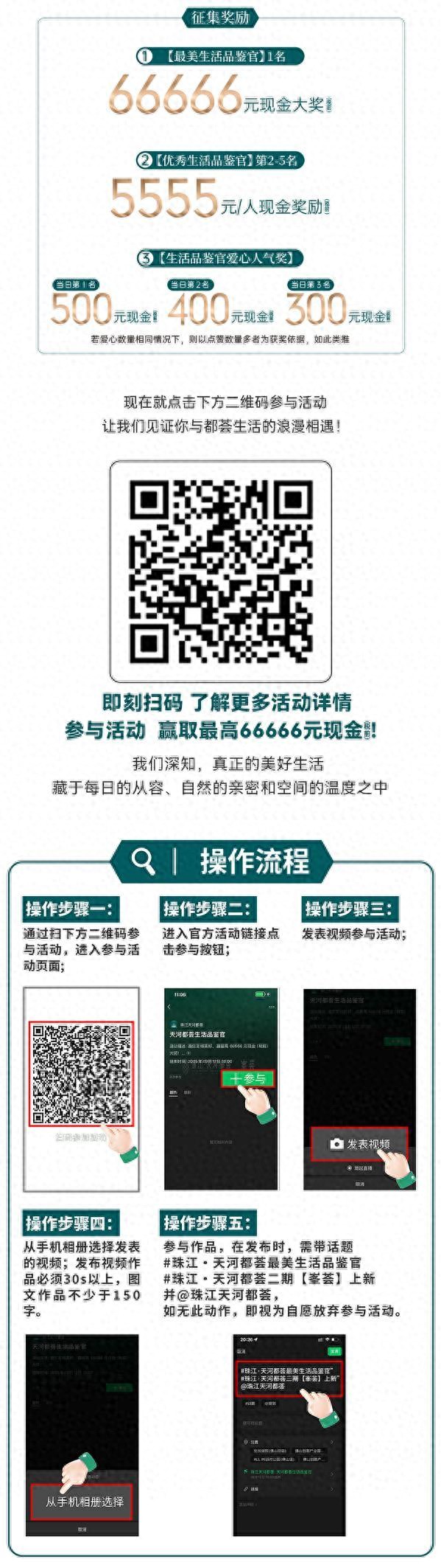 我们坚信,最美的生活不在别处,就在你用心经营的每个当下。以品鉴珠江·天河都荟美好生活为主题创作视频内容,演绎对美好生活的向往。参与珠江·天河都荟最美生活品鉴官招募活动,最高可赢66666元现金大奖(税前)!为你的品味、你的热爱、你闪闪发光的生活态度加冕!珠江·天河都荟最美生活品鉴官活动时间:2025年9月1日10:00—2025年9月17日10:00。